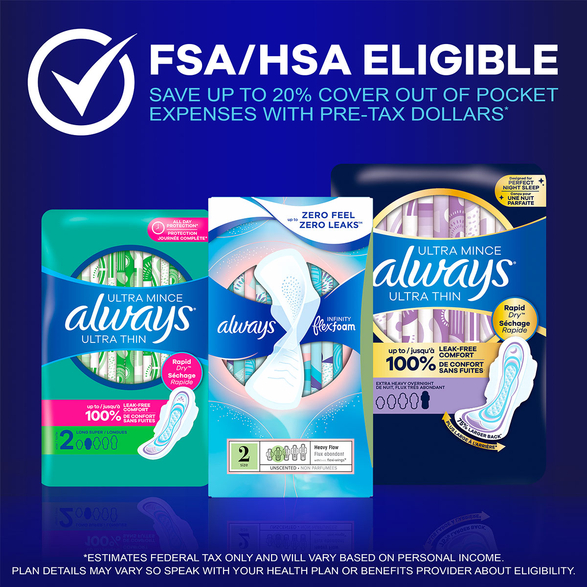 Always Ultra Thin Overnight Pads with Flexi-Wings provide you a PERFECT NIGHT SLEEP with 75% more coverage on the back for up to 100% Leak Free Comfort, no matter how you sleep. All Always Ultra Thin Pads have our 3x Protection System to give you peace of mind day and night. RapidDRY technology absorbs gushes 2X faster than the leading store brand. The LeakGUARD core locks in leaks for long-lasting protection. Plus, OdorLOCK that helps prevent unwanted odors to help you feel fresh and clean throughout your day! Plus Always Ultra Thin Pads come in a range of sizes from 1 to 5 to fit your flow and size perfectly. If you have a light flow or need a teen-sized pad, then we would recommend using our Always Ultra Thin size 1 to 3. If you have a heavy flow or want overnight protection, then we recommend using our size 4 or 5 Ultra Thin Pad. Additionally, all Always Ultra Thin packs are made of 50% recycled plastic. Remember that all Always Ultra Thin Pads are FSA & HSA eligible! Check with your FSA or HSA plan provider for information on the coverage of period care products.